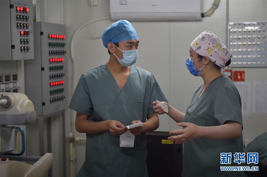 6月19日,在北京地壇醫(yī)院隔離病區(qū),一名來地壇醫(yī)院支援的護(hù)士(左)在跟地壇醫(yī)院的護(hù)士學(xué)習(xí)使用對講機(jī)。新華社記者彭子洋攝