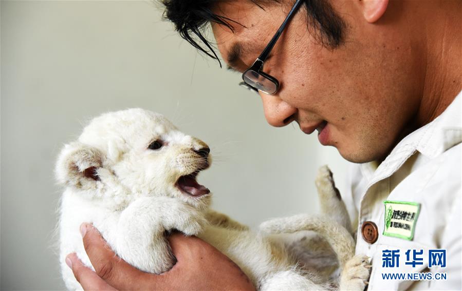 6月14日,濟(jì)南野生動(dòng)物世界飼養(yǎng)員何樹寶與一只滿月小白獅在一起。新華社記者王凱攝