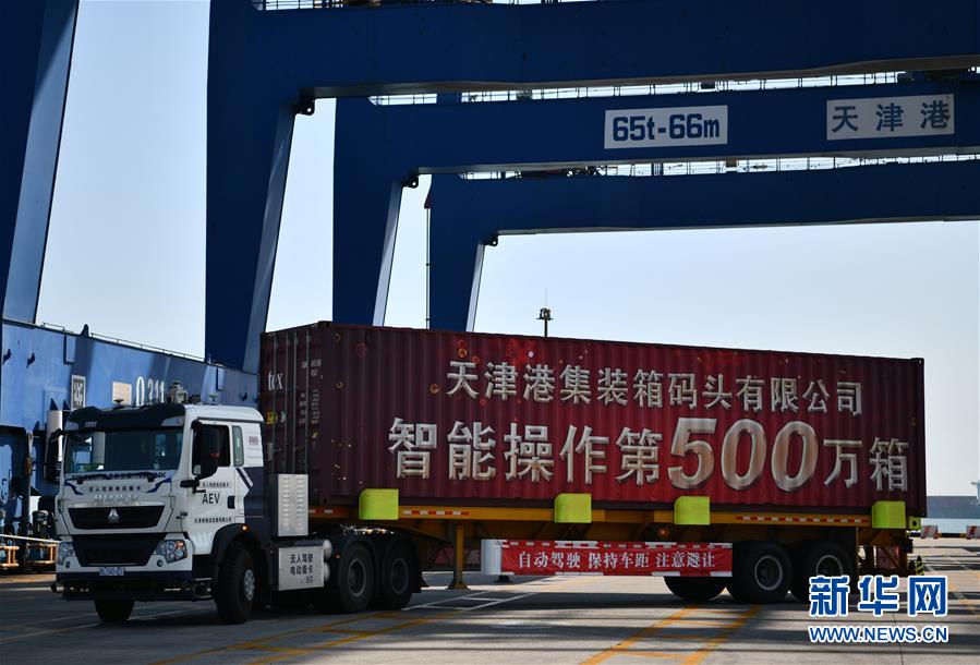 在天津港集裝箱碼頭有限公司北區(qū)智能碼頭自動化堆場,裝載著集裝箱的無人駕駛電動集裝箱卡車向碼頭駛去(2019年9月26日攝)。新華社記者李然攝