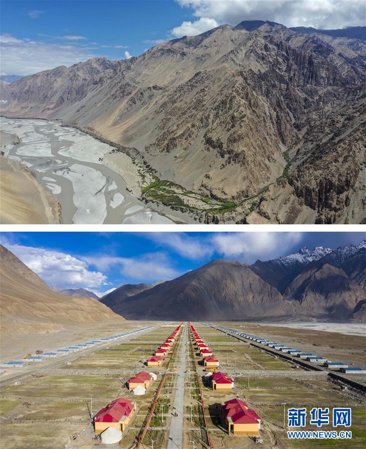 拼版照片:上圖為新疆塔什庫爾干塔吉克自治縣熱斯喀木村易地扶貧搬遷前一處散居的居住點(2019年7月8日攝,無人機照片);下圖為實施易地扶貧搬遷后的熱斯喀木村新貌(6月6日攝,無人機照片)。新華社記者胡虎虎攝
