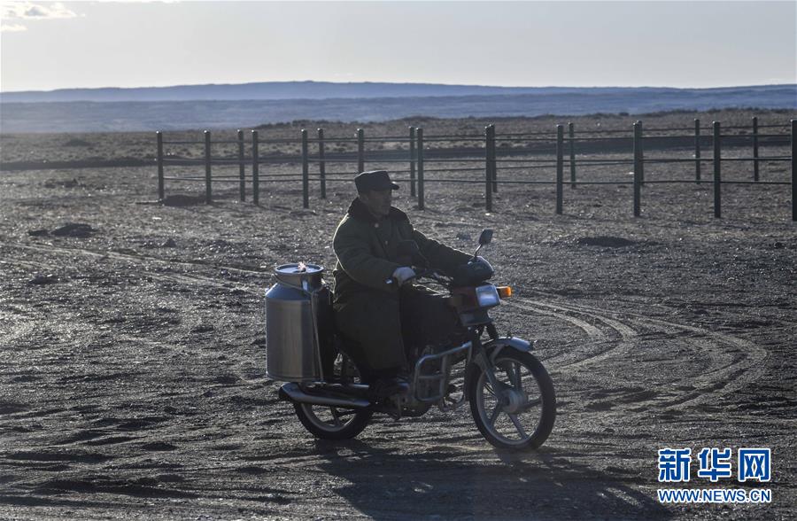 在吉木乃縣萬駝園內(nèi),傍晚時(shí)分,牧民米拉木別克·阿依提克準(zhǔn)備騎著摩托車將駱駝趕回圈內(nèi)(6月21日攝)。