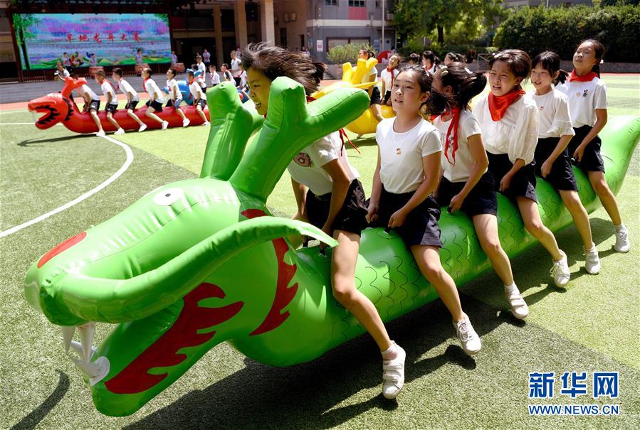 6月24日,西安市新城區(qū)后宰門小學(xué)的學(xué)生在進(jìn)行旱地龍舟比賽。端午節(jié)臨近,各地舉行包粽子、做香包、賽龍舟等豐富多彩的民俗文化活動,迎接傳統(tǒng)佳節(jié)的到來。新華社記者劉瀟攝