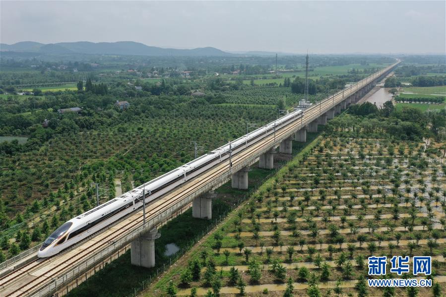 6月28日,列車在商合杭高鐵浙江安吉縣境內(nèi)行駛(無(wú)人機(jī)照片)。新華社記者黃宗治攝