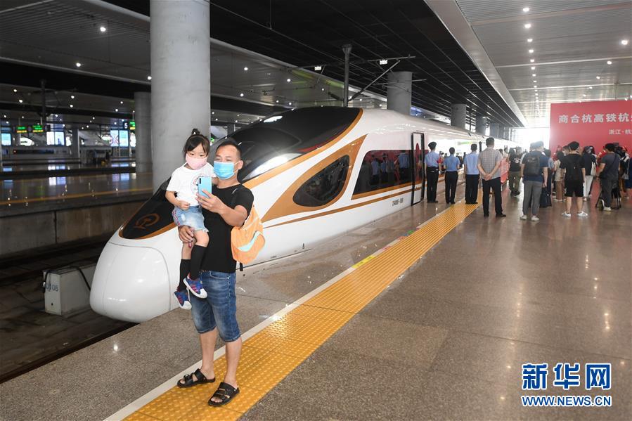 6月28日,在杭州東站,乘坐商合杭高鐵杭州至合肥段首發(fā)列車的旅客在登車前留影。新華社記者黃宗治攝