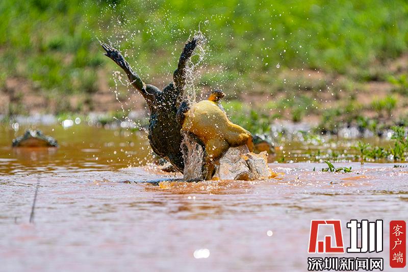 2020年6月30日?qǐng)?bào)道(具體拍攝時(shí)間不詳),南非波羅克瓦克,兩只雄性非洲牛蛙為了爭(zhēng)奪雌性牛蛙,在池塘中打架,這樣的情形十分罕見(jiàn)。畫(huà)面中,戰(zhàn)況十分激烈,一只非洲牛蛙在另外一只試圖逃到池塘邊緣時(shí)撕咬對(duì)手,甚至將另外一只拋向空中。這些精彩的照片是由南非開(kāi)普敦?cái)z影師Temujin Johnson拍攝的。