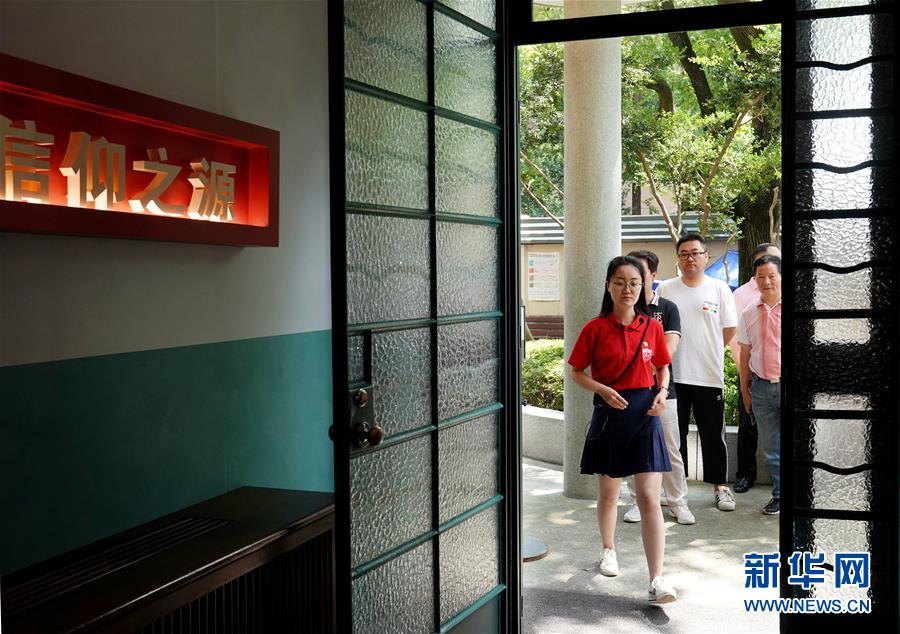 6月30日,復(fù)旦大學(xué)《共產(chǎn)黨宣言》展示館黨員志愿服務(wù)隊(duì)隊(duì)員、復(fù)旦大學(xué)數(shù)學(xué)科學(xué)學(xué)院學(xué)生張曉菲引領(lǐng)觀眾入館參觀。新華社記者劉穎攝