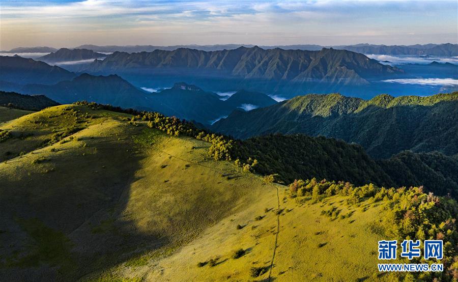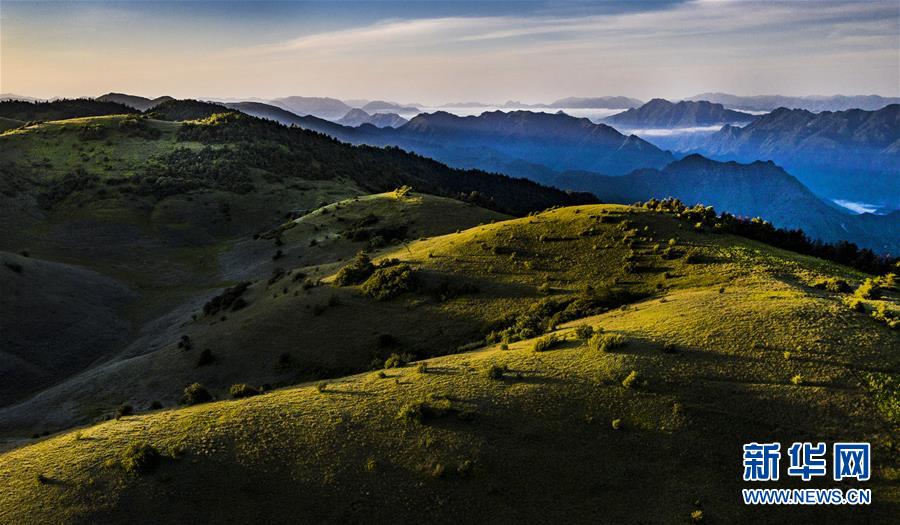 6月30日,朝霞照耀下的神田草甸與遠(yuǎn)處的群峰(無人機(jī)照片)。位于陜西省安康市嵐皋縣與重慶市城口縣交界處大巴山神田主脊北坡的神田草甸,面積超過1.1萬畝。夏日的朝霞中,起伏的草甸仿佛一塊寬大無邊的綠色地毯,鑲嵌在大巴山上,如詩如畫。新華社記者陶明攝