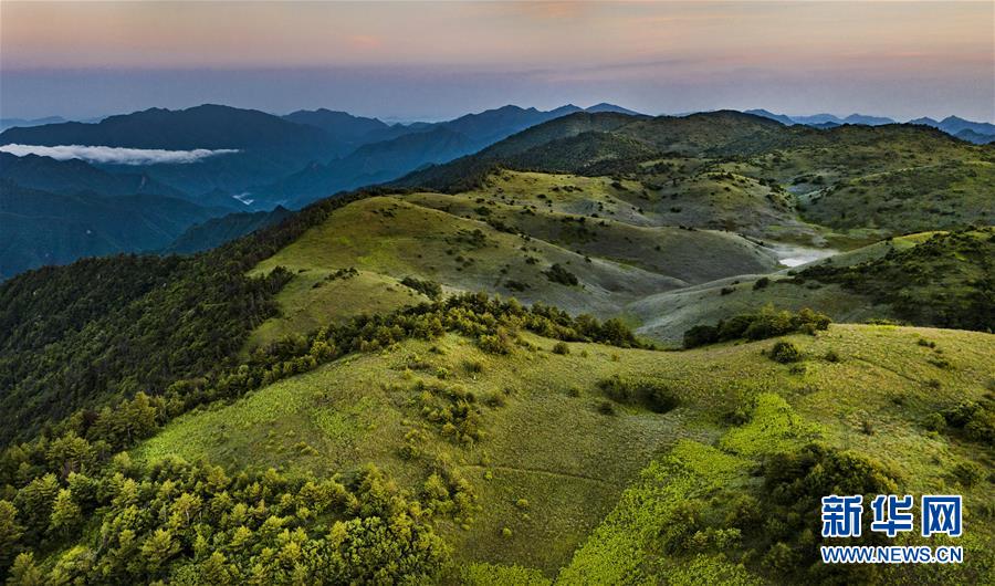 6月30日,朝霞照耀下的神田草甸(無人機(jī)照片)。位于陜西省安康市嵐皋縣與重慶市城口縣交界處大巴山神田主脊北坡的神田草甸,面積超過1.1萬畝。夏日的朝霞中,起伏的草甸仿佛一塊寬大無邊的綠色地毯,鑲嵌在大巴山上,如詩如畫。新華社發(fā)(邱仕君攝)