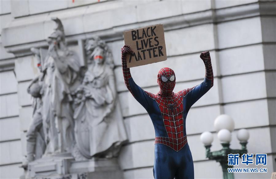 6月30日,一名打扮成“蜘蛛俠”的抗議者在美國紐約市政廳附近手舉寫有“黑人的命也是命”的標(biāo)語。由美國明尼蘇達(dá)州明尼阿波利斯市非裔男子弗洛伊德遭白人警察暴力執(zhí)法而死一事引發(fā)的各種抗議活動(dòng)仍在紐約持續(xù)進(jìn)行。新華社記者王迎攝