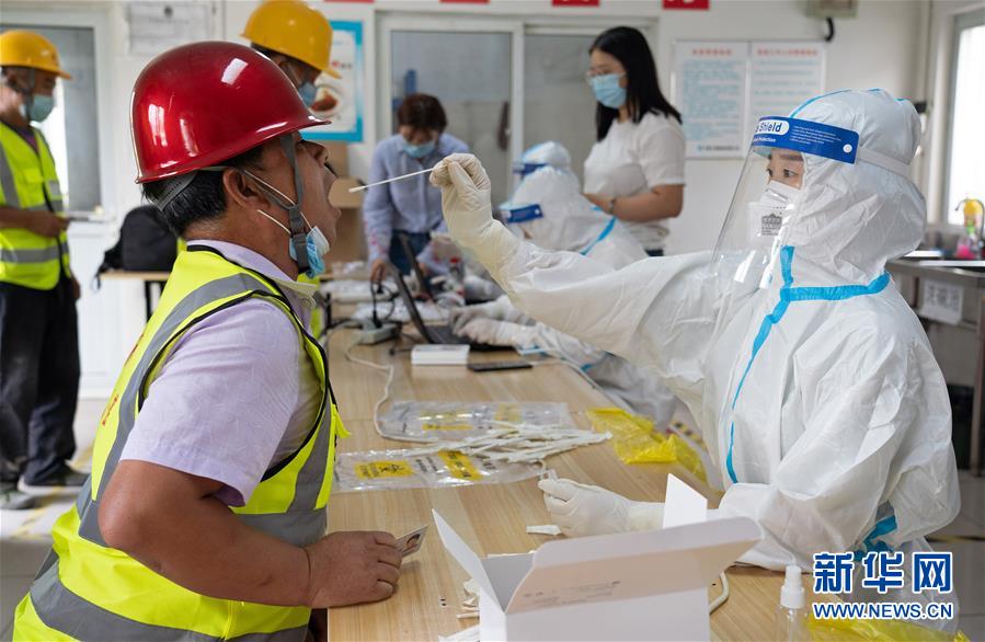 7月2日,在北京市大興區(qū)中建三局二公司北京公司一項目建筑工地的臨時核酸檢測采樣點,醫(yī)護(hù)人員為建筑工地人員采集咽拭子。新華社記者才揚攝