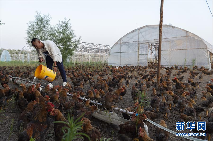 7月1日,在位于黑龍江省五大連池市桑慶軍的雞場(chǎng)上,桑慶軍在給雞喂水。新華社記者謝劍飛攝