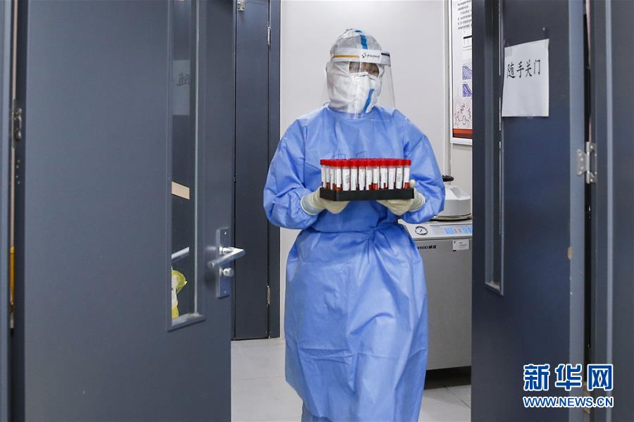 7月3日,中日友好醫(yī)院檢驗科新冠核酸檢測實驗室的檢驗人員閆克芹運(yùn)送經(jīng)過滅活的樣本。新華社記者張玉薇攝