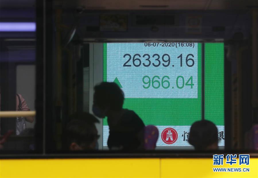 7月6日,人們從位于香港中環(huán)的股市信息屏前經(jīng)過。香港恒生指數(shù)6日漲966.04點(diǎn),漲幅3.81%,收?qǐng)?bào)26339.16點(diǎn)。全日主板成交2507.97億港元。新華社記者李鋼攝
