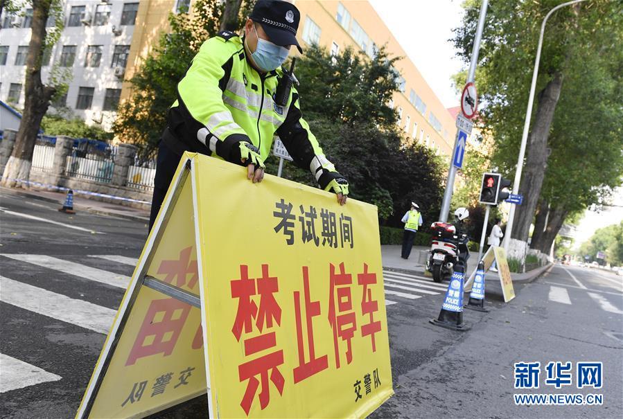 7月7日,在吉林省長春市的東北師范大學(xué)附屬中學(xué)考點外,執(zhí)勤交警在道路上架設(shè)提示牌。當(dāng)日,2020年高考拉開帷幕。新華社記者許暢攝