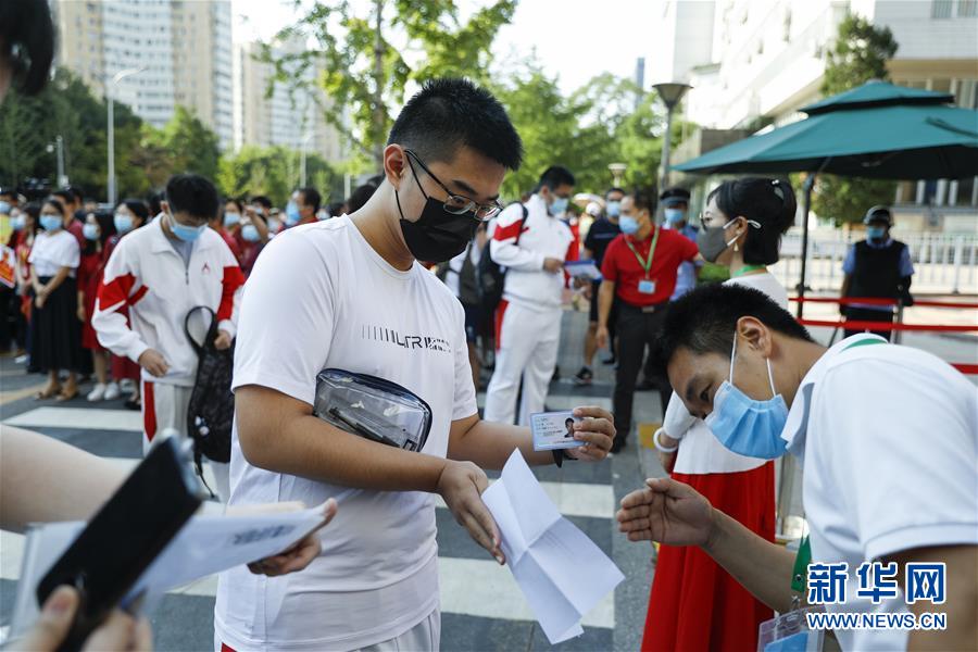 7月7日,在位于北京的中國(guó)人民大學(xué)附屬中學(xué)考點(diǎn)外,工作人員查驗(yàn)考生準(zhǔn)考證和身份證等證件信息。當(dāng)日,2020年高考拉開(kāi)帷幕。新華社記者沈伯韓攝