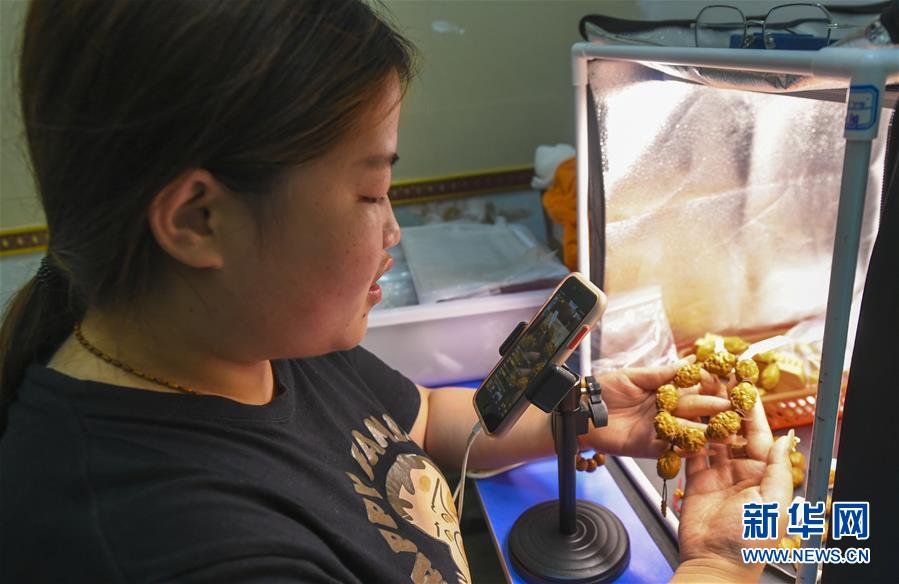 7月7日,河北省永清縣別古莊鎮(zhèn)核雕企業(yè)網(wǎng)絡主播在網(wǎng)絡直播銷售核雕產(chǎn)品。河北省永清縣有核雕企業(yè)1500余家,相關從業(yè)人員4萬余人。今年以來,該縣克服疫情影響,廣泛利用電商平臺進行網(wǎng)絡直播銷售,網(wǎng)上銷售額已占總銷售額的90%以上,有效緩解了線下銷售壓力,為當?shù)貛砹己玫慕?jīng)濟效益。新華社記者李曉果攝