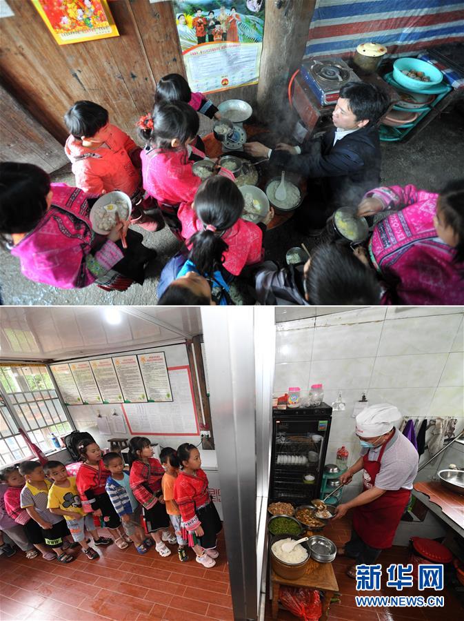 這是一張拼版照片,上圖:在廣西龍勝龍脊鎮(zhèn)江柳村翁江小學(xué),余啟貴老師在給學(xué)生盛午飯(2013年2月26日攝);下圖:在廣西龍勝龍脊鎮(zhèn)江柳村翁江小學(xué),余啟貴老師在給學(xué)生盛午飯(7月7日攝)。新華社記者陸波岸攝