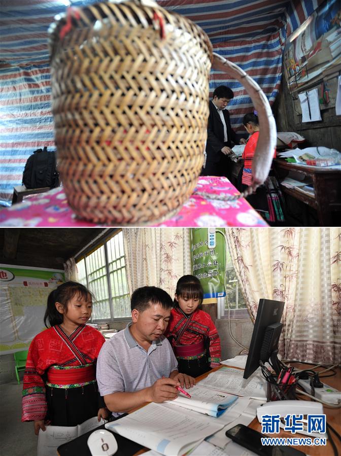 這是一張拼版照片,上圖:在廣西龍勝龍脊鎮(zhèn)江柳村翁江小學(xué),余啟貴老師在課間輔導(dǎo)學(xué)生功課(2013年2月26日攝);下圖:在廣西龍勝龍脊鎮(zhèn)江柳村翁江小學(xué),余啟貴老師在課間輔導(dǎo)學(xué)生功課(7月7日攝)。新華社記者陸波岸攝