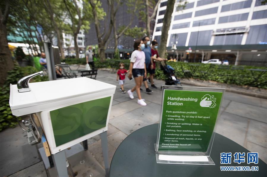 7月8日,行人從美國紐約布萊恩特公園的洗手設(shè)施旁經(jīng)過。美國約翰斯·霍普金斯大學(xué)8日發(fā)布的新冠疫情最新統(tǒng)計數(shù)據(jù)顯示,美國累計確診病例超過300萬例。數(shù)據(jù)顯示,截至美國東部時間8日11時34分(北京時間23時34分),美國累計確診病例3016515例,累計死亡病例131594例。新華社記者王迎攝