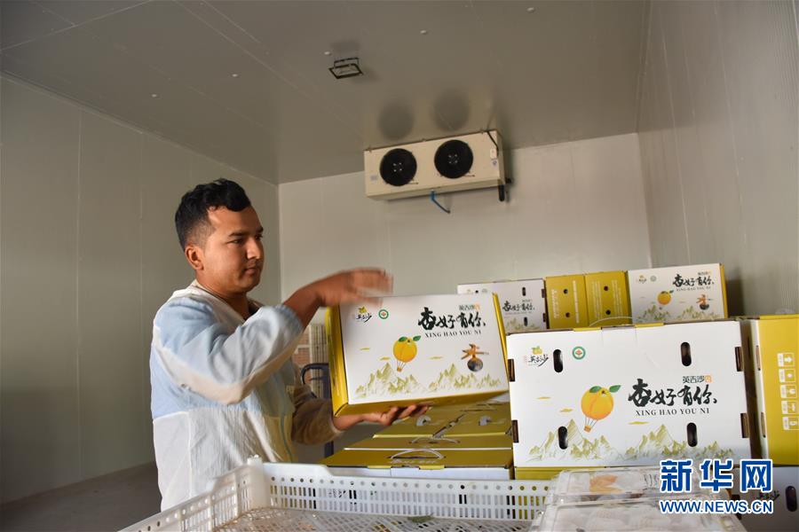 在新疆英吉沙縣一家合作社內(nèi),員工將包裝好的杏子放入冷庫(7月3日攝)。新華社記者高晗攝