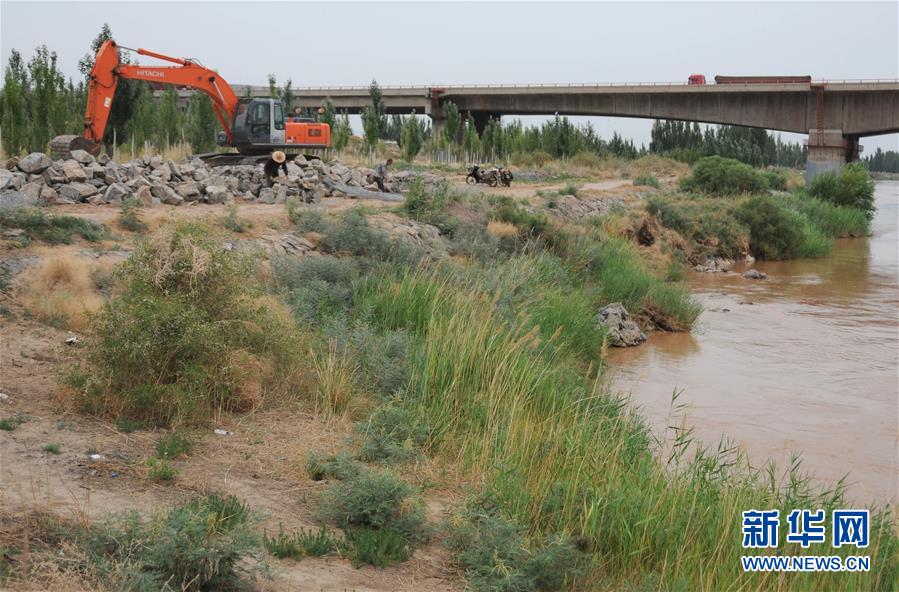 7月11日,工人在黃河內(nèi)蒙古磴口段南套子險工段進(jìn)行除險加固。新華社記者李云平攝