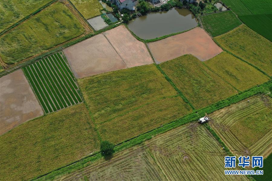 7月11日,在湖南省衡陽市衡陽縣臺源鎮(zhèn)臺九村,村民駕駛收割機收割早稻(無人機照片)。近日,湖南各地農(nóng)村陸續(xù)進入“雙搶”季,農(nóng)民緊抓農(nóng)時,搶收搶種,力爭糧食穩(wěn)產(chǎn)豐收。新華社記者趙眾志攝