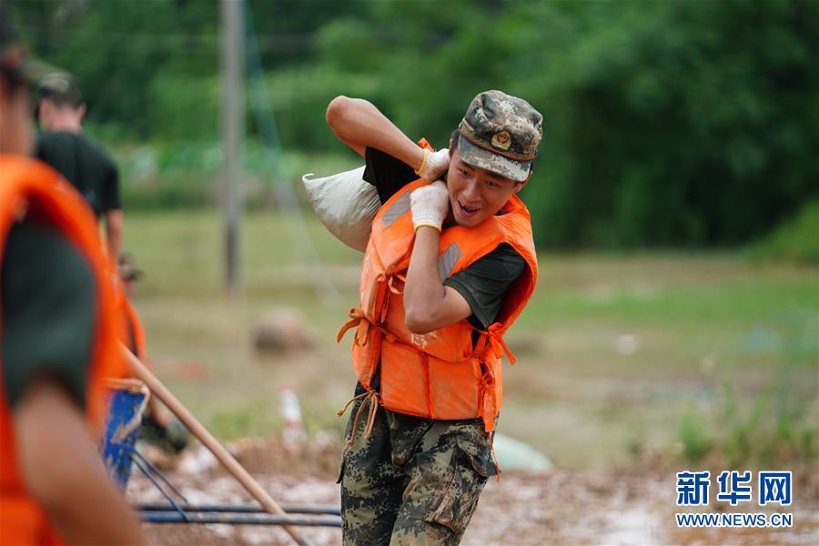 武警戰(zhàn)士在江西省鄱陽(yáng)縣鄱陽(yáng)鎮(zhèn)江家?guī)X村搬運(yùn)沙袋(7月11日攝)。新華社記者 周密 攝