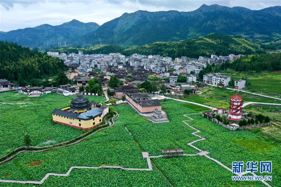 7月3日,浦源村鯉魚(yú)溪公園內(nèi)荷花盛開(kāi),吸引游人前來(lái)觀賞(無(wú)人機(jī)照片)。新華社記者 姜克紅 攝