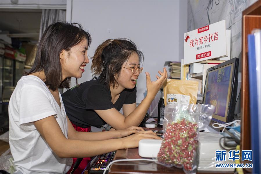 在位于新疆精河縣城的工作室內,朱虹美(右)和助手李紅英討論制作要發(fā)布的農產品推廣視頻(7月11日攝)。新華社記者 胡虎虎 攝