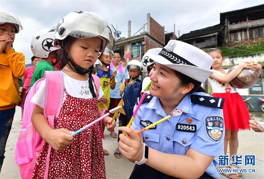 7月11日,柳州市交警支隊民警給小朋友贈送交通標(biāo)志鉛筆。當(dāng)日,廣西柳州市交警支隊的民警來到融水苗族自治縣大浪鎮(zhèn)大新村紅鄧屯教學(xué)點,開展暑期交通安全教育活動,增強孩子們的安全出行意識。新華社記者黃孝邦攝
