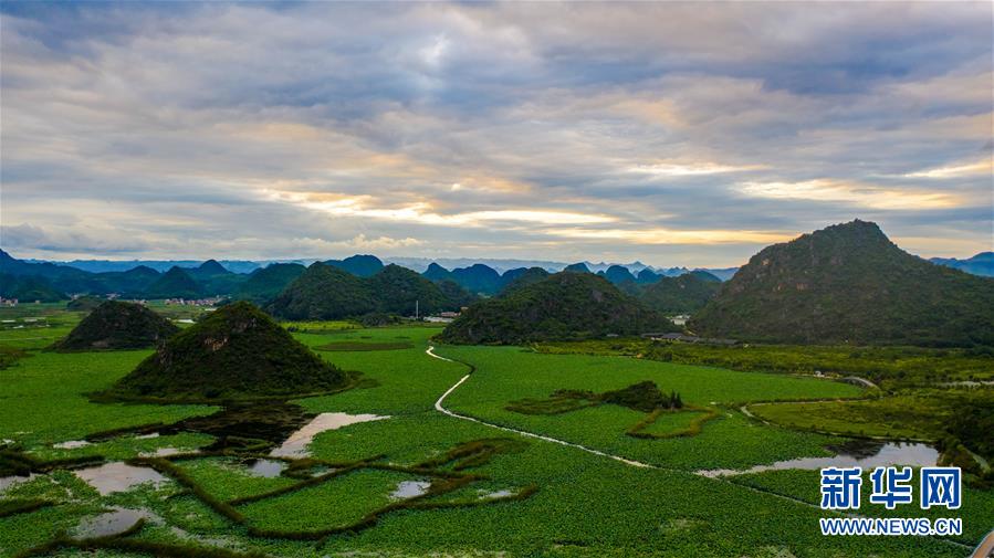 這是7月8日拍攝的普者黑國家濕地公園的夕陽景觀(無人機(jī)照片)。