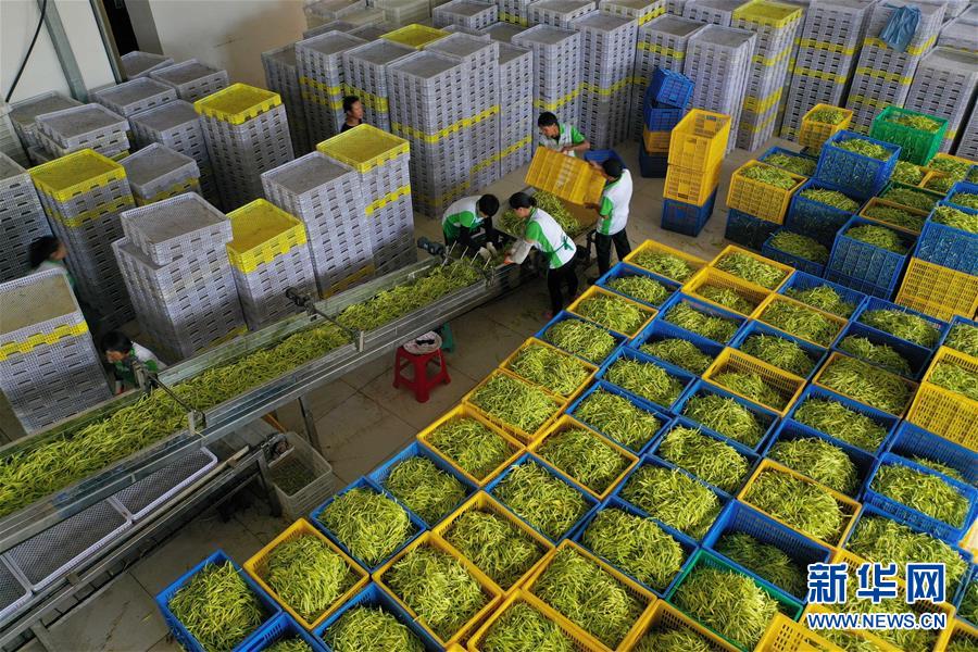 7月12日,祁東縣黃土鋪鎮(zhèn)雁隆食品公司內(nèi),工人通過傳送帶運(yùn)送黃花菜準(zhǔn)備加工(無(wú)人機(jī)照片)。新華社記者 趙眾志 攝