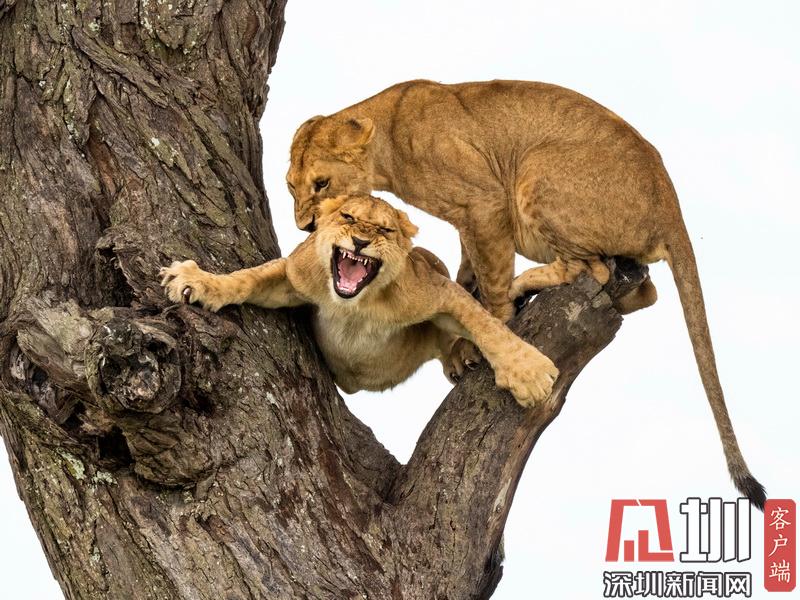 2020年7月13日?qǐng)?bào)道(具體拍攝時(shí)間不詳),Sandesh Kadur是一名印度野生動(dòng)物攝影師,他在坦桑尼亞塞倫蓋蒂?lài)?guó)家公園拍攝到一系列“獅子上樹(shù)”的精彩照片。畫(huà)面中,有一只憤怒的母獅為了捍衛(wèi)自己在樹(shù)上的位置,一邊劈叉一邊對(duì)著鏡頭咆哮,有兩只獅子為了爭(zhēng)奪位置互相攻擊,還有一只獅子在找到舒適的位置后呼呼大睡。