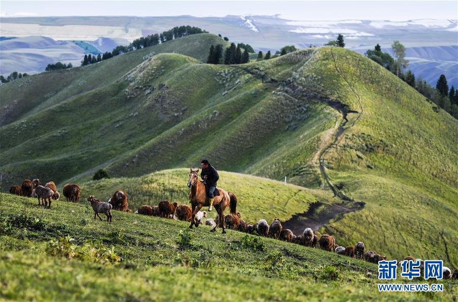 在新疆伊犁特克斯縣境內(nèi)的夏牧場里,一位牧民在放牧(7月2日攝)。新華社記者 王菲 攝