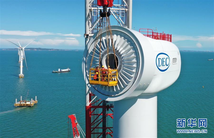 施工人員在福建福清興化灣二期海上風(fēng)電場10兆瓦海上風(fēng)電機組安裝現(xiàn)場忙碌(6月12日攝,無人機照片)。記者7月13日從三峽集團(tuán)了解到,國內(nèi)首臺10兆瓦海上風(fēng)電機組日前在三峽集團(tuán)福建福清興化灣二期海上風(fēng)電場成功并網(wǎng)發(fā)電,這是目前我國自主研發(fā)的單機容量亞太地區(qū)最大、全球第二大的海上風(fēng)電機組,刷新了我國海上風(fēng)電單機容量新紀(jì)錄。新華社記者 林善傳 攝