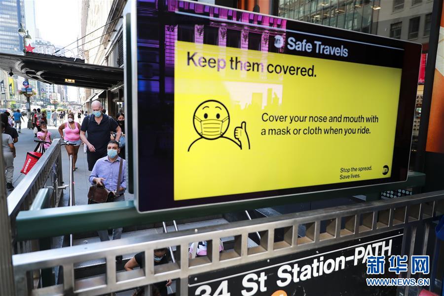 7月14日,人們佩戴口罩進(jìn)入美國紐約地鐵站。美國約翰斯·霍普金斯大學(xué):截至北京時(shí)間15日6時(shí)34分,全球新冠確診病例達(dá)13258016例,死亡病例為576752例。美國是全球疫情最嚴(yán)重的國家,確診病例達(dá)3416222例,死亡病例為136319例。新華社記者 王迎 攝