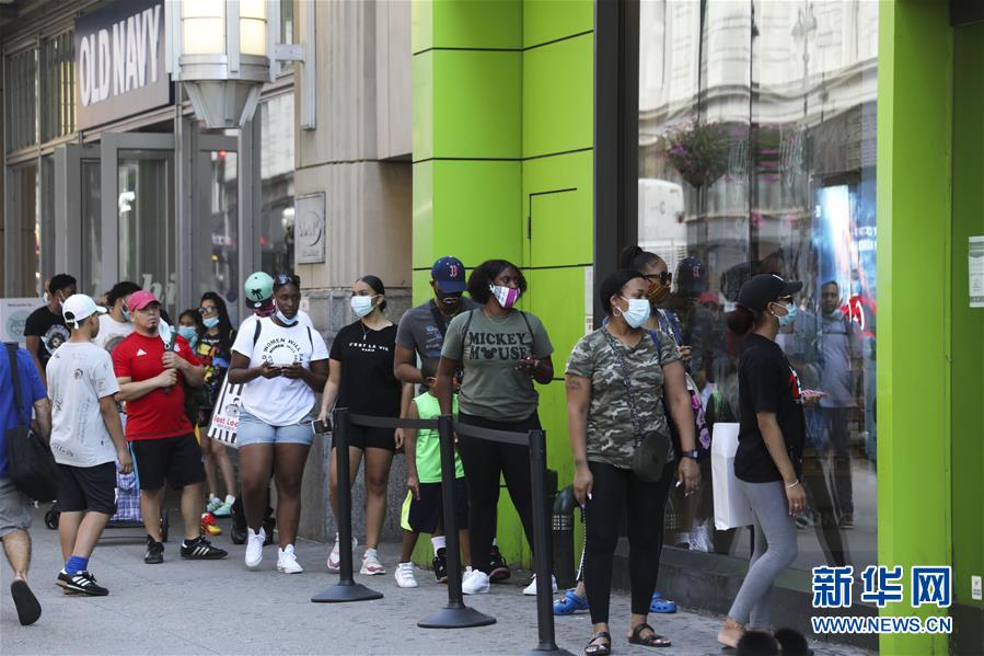 7月14日,人們?cè)诿绹~約排隊(duì)等待進(jìn)店購物。美國約翰斯·霍普金斯大學(xué):截至北京時(shí)間15日6時(shí)34分,全球新冠確診病例達(dá)13258016例,死亡病例為576752例。美國是全球疫情最嚴(yán)重的國家,確診病例達(dá)3416222例,死亡病例為136319例。新華社記者 王迎 攝
