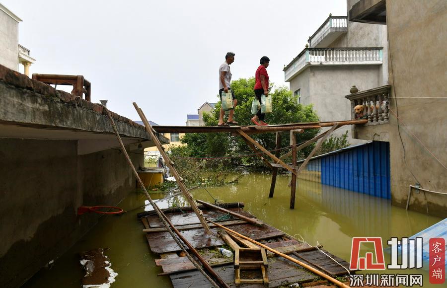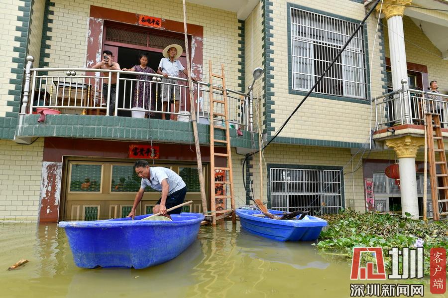 2020年7月15日,江西省鄱陽縣油墩街鎮(zhèn)同興村,村莊受到洪水圍困,大部分村民已經(jīng)被轉(zhuǎn)移出去,仍有少數(shù)村民選擇留守家中積極自救繼續(xù)生活。7月8日晚,鄱陽縣油墩街鎮(zhèn)西江因特大暴雨出現(xiàn)漫堤決口,5個行政村被洪水圍困,數(shù)萬名群眾被及時疏散轉(zhuǎn)移。同興村村民張瑤康回憶起了當時的場景,“水一下子就涌進來,等緩過神來趕緊向二樓轉(zhuǎn)移一樓的物品。洪水來時只從一樓搶到了一些輕便易拿的東西,冰箱、洗衣機之類的大物件,至今仍浸泡在一樓水中?!?5日,記者跟隨張瑤康乘船回家,抵達后看到,一樓淹沒在水中,一個綁在二樓護欄的木梯成為進出“家門”的唯一通道。“每天劃船去村里運送水和食物,家里有煤氣罐和灶臺。因為80多歲的老母親行動不便,我們選擇留守家中?!薄半m然對岸就有安置點,但還是更愿待在自己家里,一來是不愿意給政府添麻煩,二來能每天看著自己的房子心里踏實?!蓖d村村民張長來夫婦帶著剛剛領(lǐng)到的大米、方便面、飲用水乘船回到家中。記者在現(xiàn)場看到,隨著各方救援力量和物資的匯聚,被洪水圍困的村民生活雖有不便,但生活仍在繼續(xù)?!胺孔硬坏梗揖驮冢覀円e極面對,早日重建家園?!睆埇幙蹈嬖V記者。