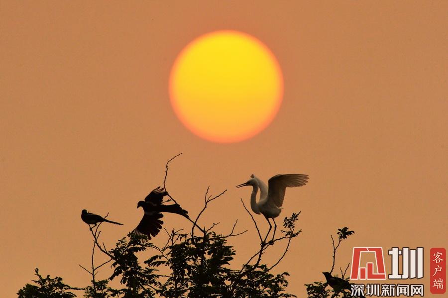2020年7月14日,在山東省青島市城陽區(qū)紅島街道一處林間,晚歸的白鷺與喜鵲在枝頭“蹁躚起舞”,優(yōu)美如畫。