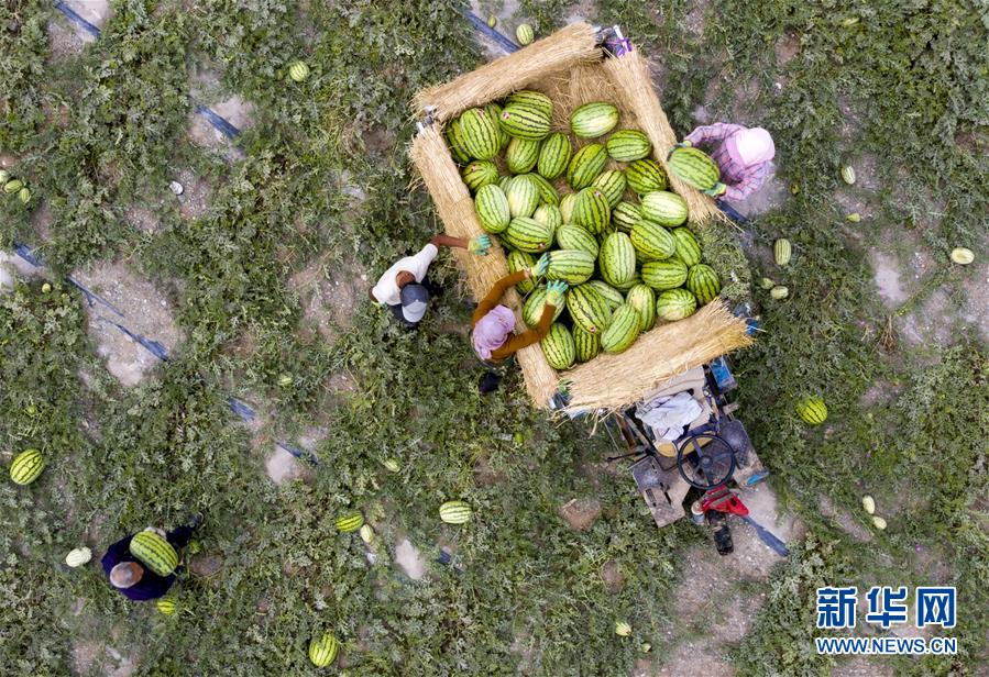 7月16日,在寧夏中衛(wèi)市香山鄉(xiāng)硒砂瓜萬(wàn)畝示范基地,瓜農(nóng)將采收的西瓜裝車(chē)(無(wú)人機(jī)照片)。近日,寧夏中衛(wèi)市迎來(lái)硒砂瓜豐收季。硒砂瓜是中衛(wèi)市的特色農(nóng)產(chǎn)品,近年來(lái),當(dāng)?shù)夭扇〖夹g(shù)創(chuàng)新、規(guī)模化種植、休耕輪作等多項(xiàng)舉措,讓硒砂瓜種植成為當(dāng)?shù)剞r(nóng)民增收致富的重要產(chǎn)業(yè)。據(jù)了解,今年中衛(wèi)市硒砂瓜種植面積為69.7萬(wàn)畝。新華社記者楊植森攝