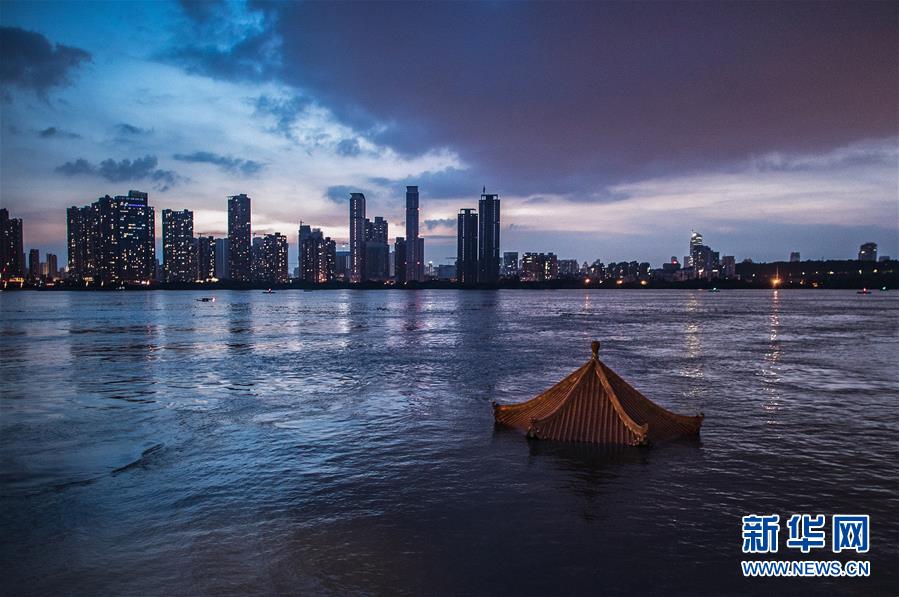 上漲的江水即將淹沒武昌黃花磯涼亭(7月13日攝)。7月13日17時,長江干流漢口站水位達(dá)28.74米,較之前的洪峰水位28.77米出現(xiàn)輕微下降。長江中下游洪水洪峰順利通過漢口江段。新華社記者肖藝九攝