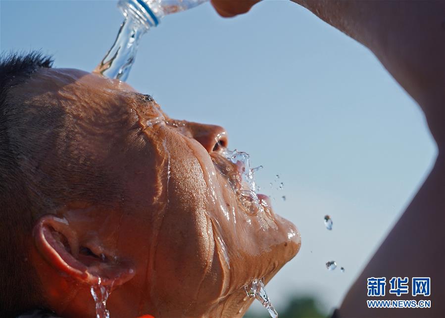 武警江西總隊上饒支隊的一名戰(zhàn)士將礦泉水倒在臉上降溫(7月14日攝)。在位于江西省余干縣古埠鎮(zhèn)的齊埠聯圩上,武警江西總隊上饒支隊的60名戰(zhàn)士頭頂烈日,揮汗如雨,在泥水中處置一處堤壩坍塌險情。新華社記者萬象攝
