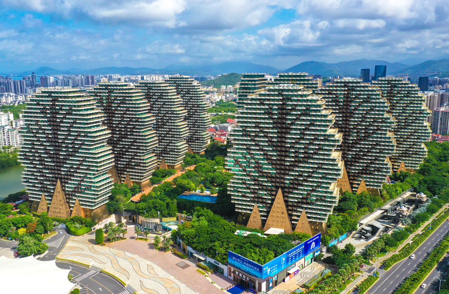 2020年7月20日,海南省三亞市,圖為航拍的“九棵大樹”建筑群,其具象性的建筑設(shè)計風(fēng)格,既有建筑之美,又見自然靈韻。
