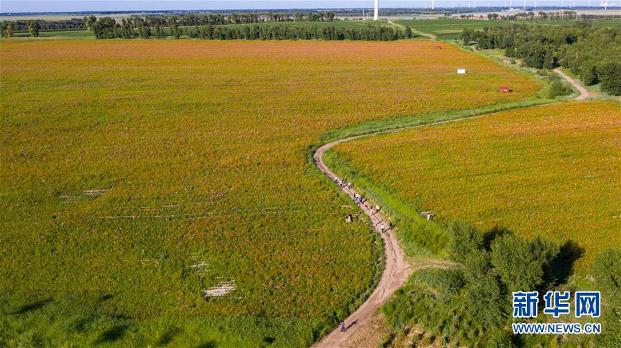 游人在查干湖花海景區(qū)游覽(7月20日攝)。新華社記者張楠攝