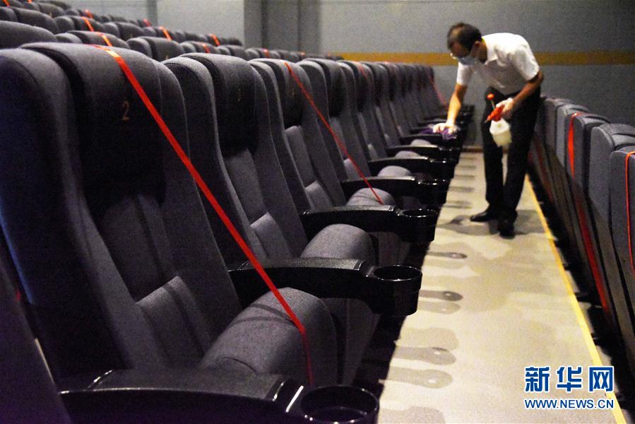 2020年7月19日,上海影城員工在放映廳里為座位消毒。當(dāng)日,上海部分電影院為恢復(fù)開放營業(yè)進(jìn)行最后階段準(zhǔn)備。新華社記者任瓏攝