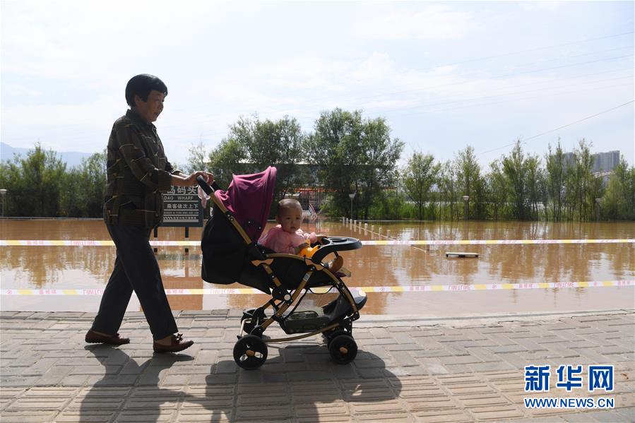 7月21日,在甘肅省臨夏回族自治州永靖縣黃河岸邊,一名推著嬰兒車(chē)的市民從警戒線(xiàn)旁走過(guò)。新華社記者陳斌攝