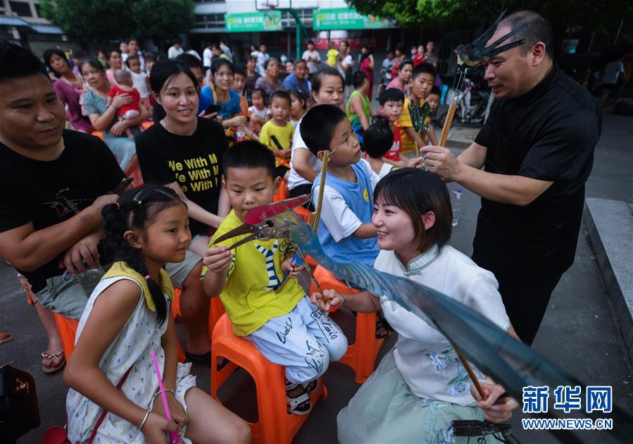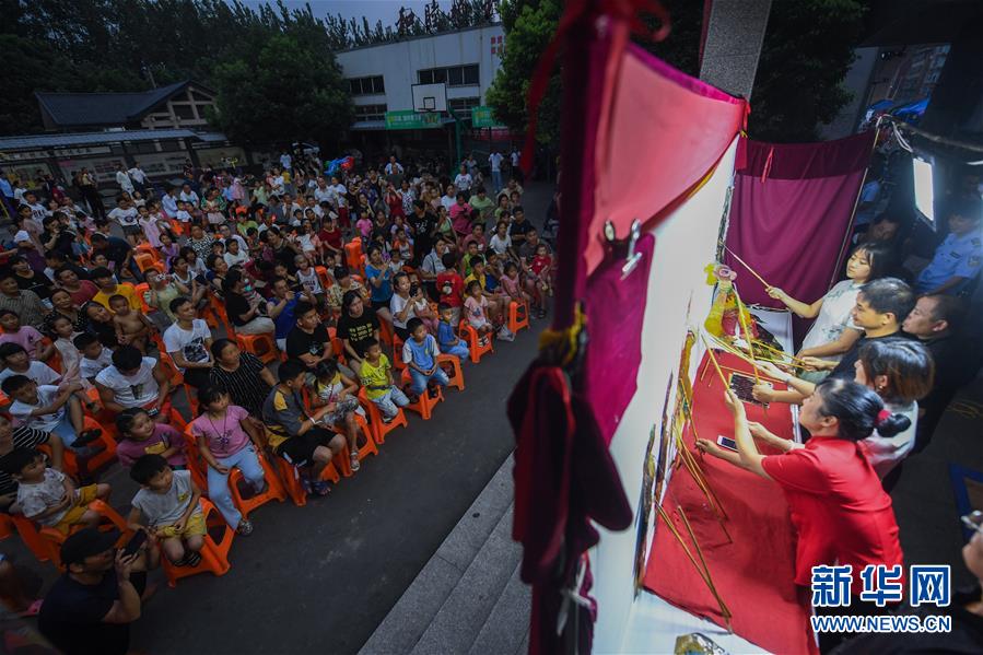 當(dāng)日,浙江省杭州市余杭區(qū)塘棲鎮(zhèn)河西埭村“衛(wèi)家班皮影戲”劇團(tuán)的藝人們來到余杭區(qū)喬司街道和睦橋村進(jìn)行演出,這是近期杭州市余杭區(qū)夏季鄉(xiāng)村“文化走親”的重要活動之一。今年6月開始,杭州市余杭區(qū)塘棲鎮(zhèn)組織多支文化表演團(tuán)體以“文化走親”的形式,先后送戲到余杭區(qū)近20個(gè)鄉(xiāng)村文化禮堂,豐富夏日鄉(xiāng)村百姓文化生活。在余杭塘棲一帶,歷史上曾活躍著一支以演出皮影戲出名的民間戲班子,號稱“衛(wèi)家班”。2016年,塘棲鎮(zhèn)河西埭村在文化禮堂的建設(shè)過程中,將當(dāng)?shù)貍鹘y(tǒng)的“衛(wèi)家班皮影戲”作為“一村一品”特色項(xiàng)目進(jìn)行了搶救性保護(hù)。2018年12月,“衛(wèi)家班皮影戲”被列入杭州市非物質(zhì)文化遺產(chǎn)代表性項(xiàng)目名錄。新華社記者徐昱攝