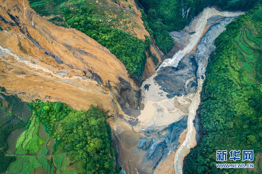 7月22日拍攝的因恩施州屯堡鄉(xiāng)馬者村山體滑坡形成的堰塞湖(無人機(jī)照片)。新華社記者肖藝九攝