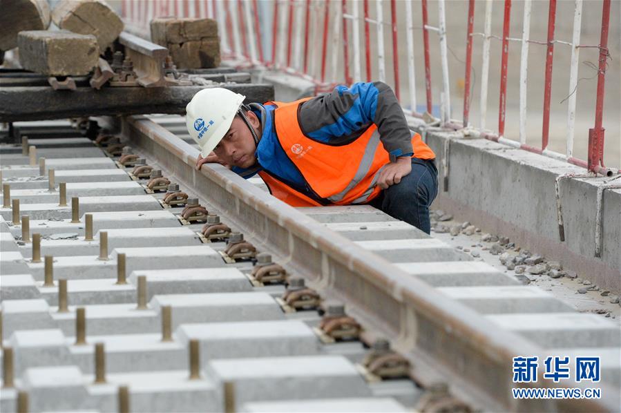 中鐵一局的施工人員在格庫鐵路新疆段查看軌排鋪設情況(7月19日攝)。新華社記者 丁磊 攝