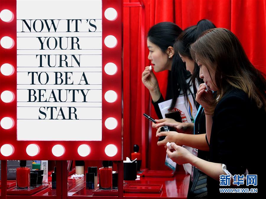 在第二屆進(jìn)博會(huì)品質(zhì)生活展區(qū),觀眾在歐萊雅旗下品牌彩妝展臺(tái)試用口紅(2019年11月6日攝)新華社記者 劉穎 攝